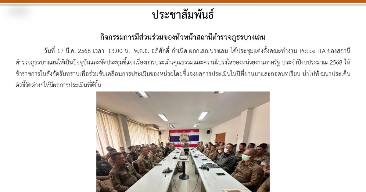 ผกก.สภ.บางเลน ได้จัดอบรมข้าราชการตำรวจในสังกัด สภ.บางเลน เรื่อง เสริมสร้างความรู้ความเข้าใจให้เจ้าหน้าที่ ในการจัดการทรัพย์สินของทางราชการของบริจาคและการจัดเก็บของกลาง เพื่อป้องกันการทุจริตภายในหน่วยงาน