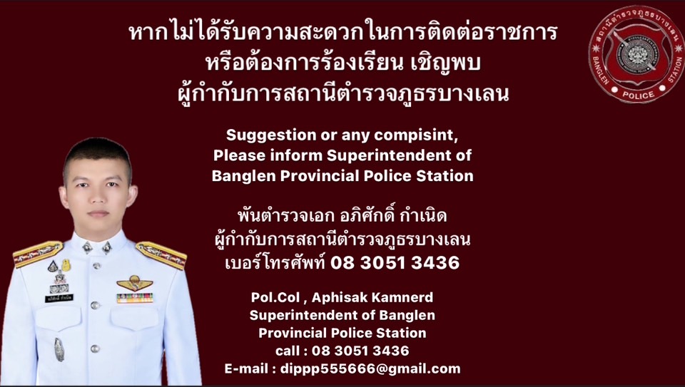 - จดหมาย/ไปรษณีย์ : สถานีตำรวจภูธรบางเลน 246 ตำบลบางเลน อำเภอบางเลน นครปฐม 73130