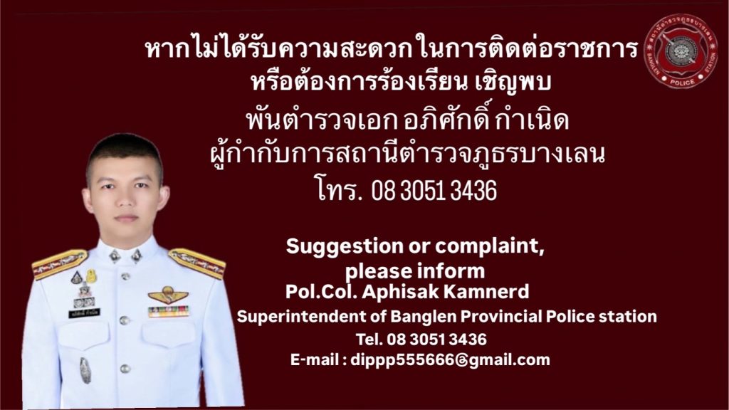 - ไปรษณีย์อิเล็กทรอนิกส์ : banglenpolice.191@gmail.com