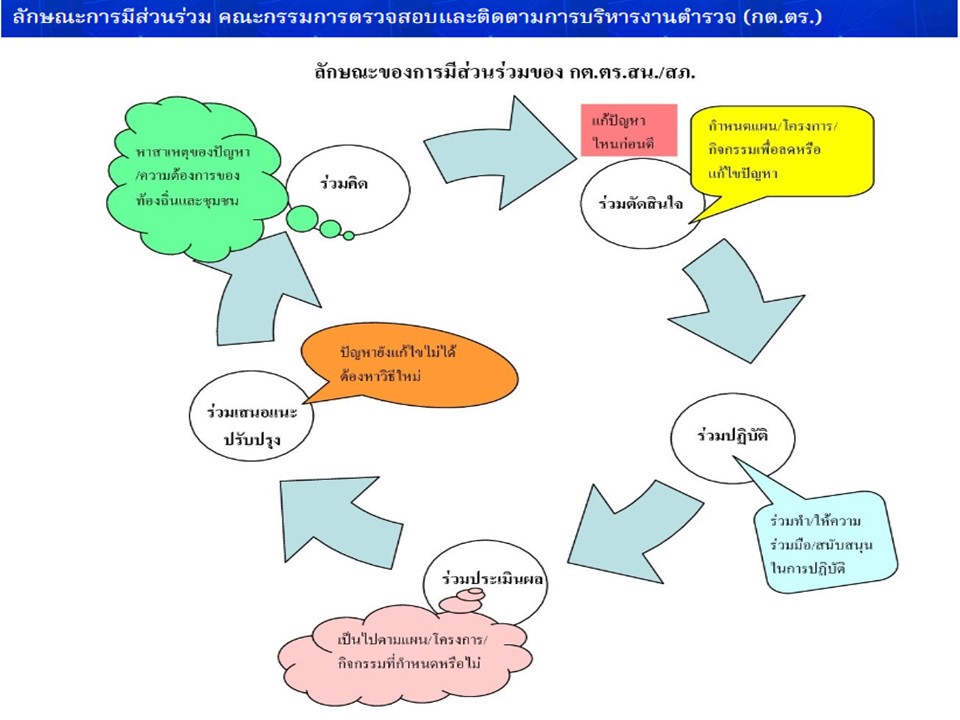 3. ภารกิจการมีส่วนร่วม เนื่องจากองค์กร กต.ตร.ในปัจจุบันเป็นองค์กรที่มีประชาชนในท้องถิ่น / ชุมชนเป็นกรรมการในสัดส่วนที่เท่า ๆ กันกับข้าราชการ ดังนั้นตามระเบียบ ก.ต.ช. ว่าด้วยหลักเกณฑ์และวิธีการส่งเสริมให้ท้องถิ่นและชุมชนมีส่วนร่วมในกิจการตำรวจ พ.ศ. 2549 จึงกำหนดให้ กต.ตร. เป็นองค์กรสำคัญมีบทบาทเป็นแกนนำในการให้ท้องถิ่น/ชุมชน เข้ามามีส่วนร่วมในการป้องกันปราบปรามอาชญากรรมและการรักษาความปลอดภัยในชีวิตและทรัพย์สินของประชาชน โดยกำหนดบทบาท ภารกิจของ กต.ตร.สน./สภ. กต.ตร.กทม. และ กต.ตร.จังหวัด ไว้ดังนี้